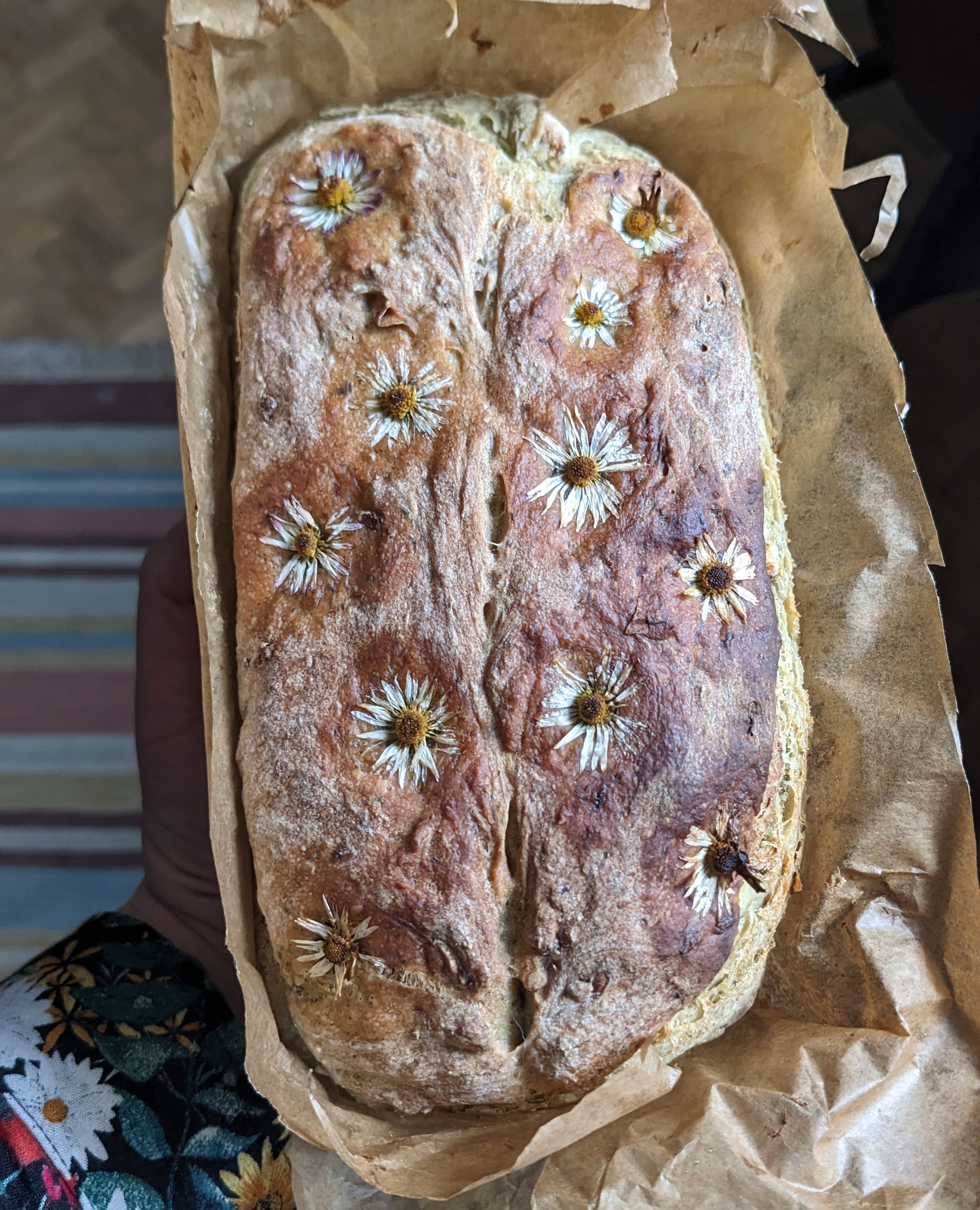 This is one of my favourite recipes that I developed for myself over the past number of years. I made it for the first time in 2022 and must have baked it about fifty loaves since then. It is so simple, requires no kneading and doesn’t need any baking expertise to get a perfect loaf. It is also very adaptable so if you don’t have wild garlic you can add nettles, cabbage, caramelised onion, mixed seeds, a little bit of cheese or even just some buttered mash can go in place of the champ. The potatoes give this loaf so much lovely texture and moisture so it lasts well and toasts beautifully too after a few days. Daisies are optional (but very beautiful).