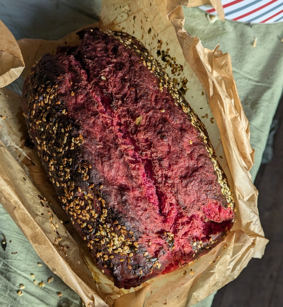 Lastly! This can be made with other ingredients too – I have had success using mashed carrot or even mashed beetroot and it always comes out deliciously so if you have a random leftover vegetable I recommend trying this out too. This loaf was made with beetroot and dock leaf.